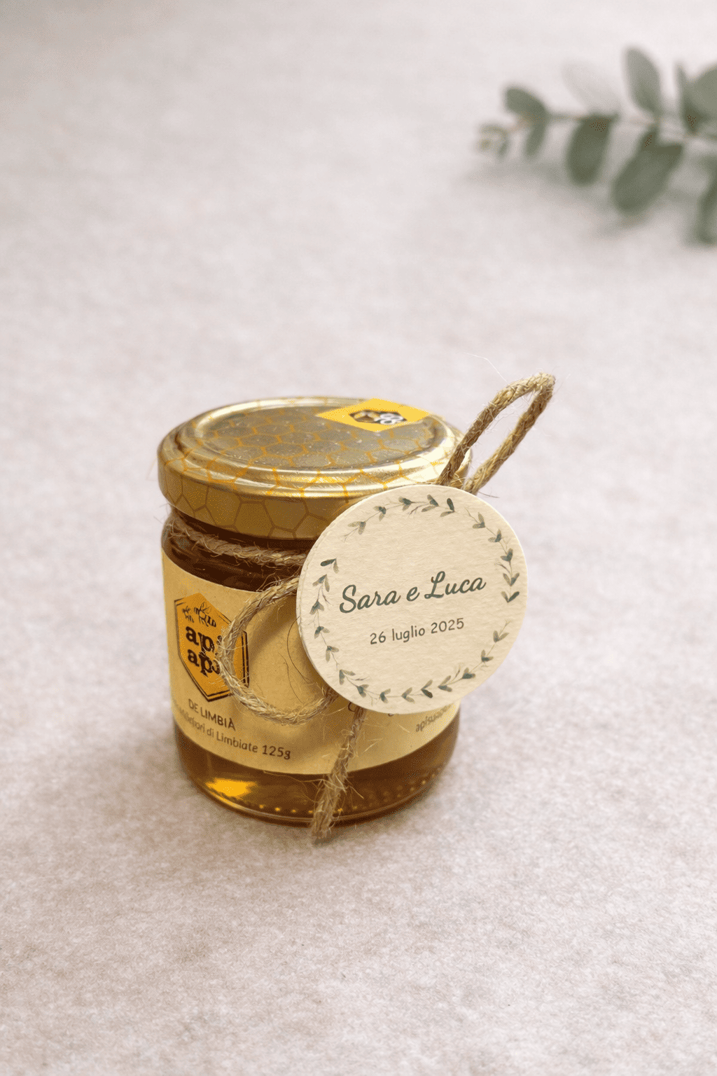 Contenuto: vasetto di miele da 125g con tag personalizzato.